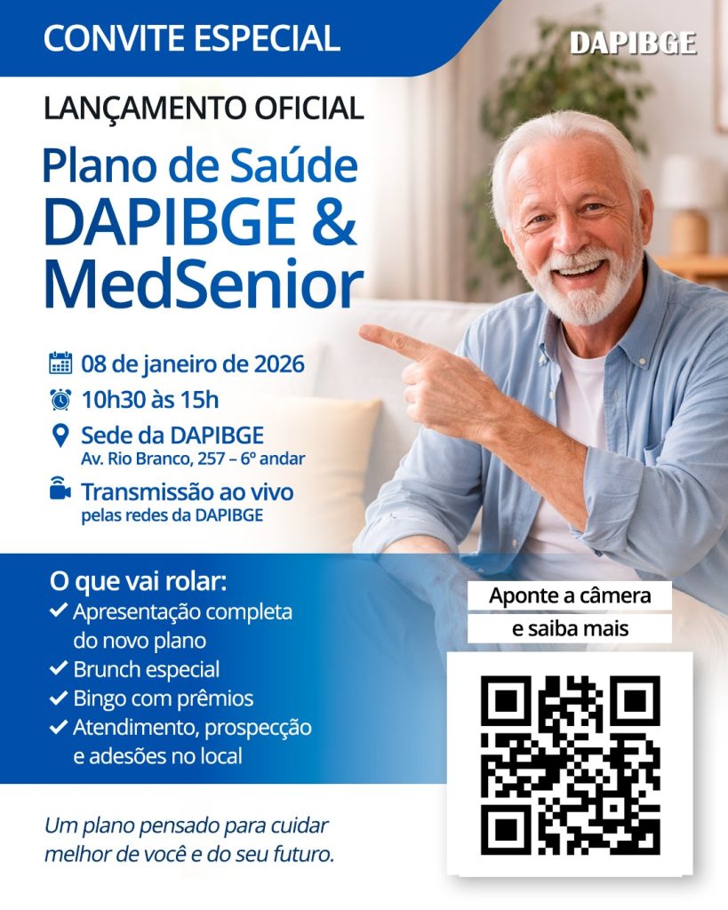 Preparem-se para um dia muito especial e cheio de surpresas! 🎉 No dia 8 de janeiro de 2026 , será lançado oficialmente o novo Plano de Saúde DAPIBGE & MedSenior – um momento histórico que vai transformar a forma como cuidamos da saúde e do bem-estar dos nossos associados! 💙