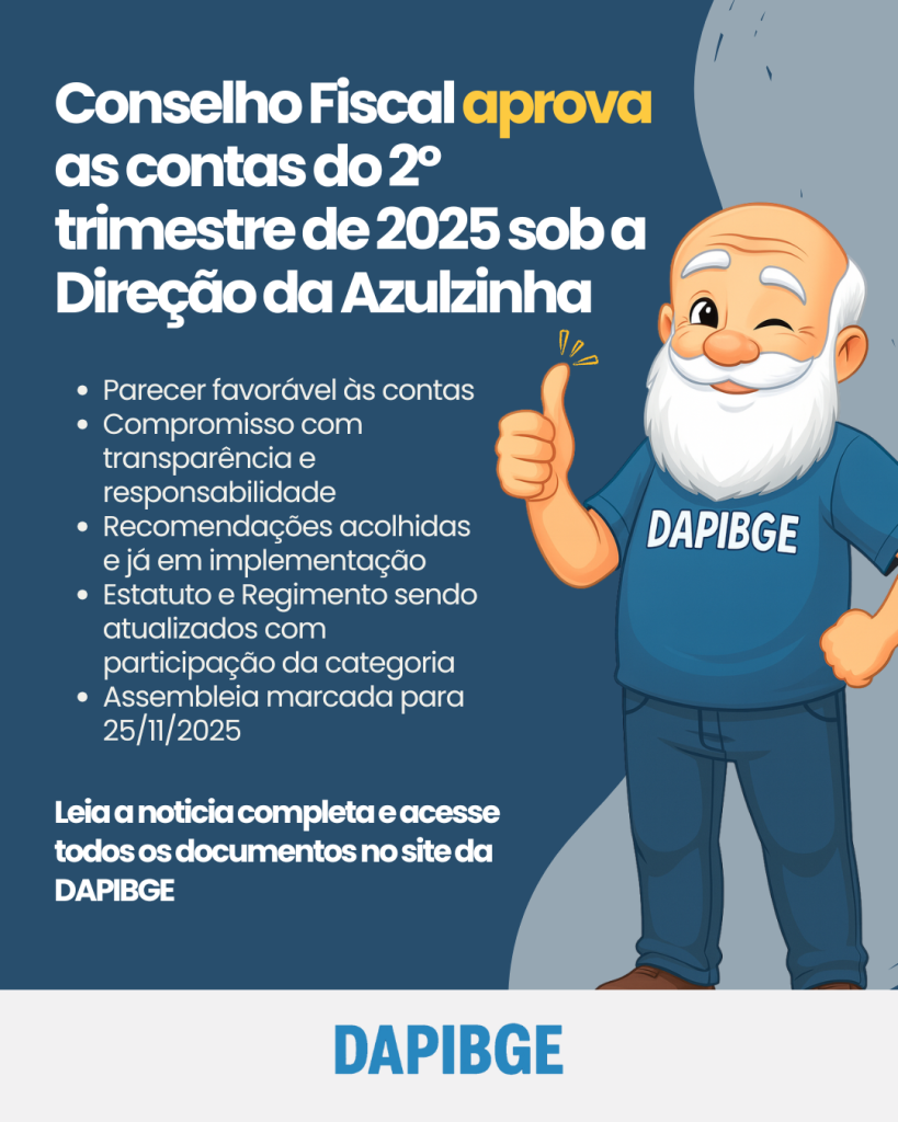Comunicamos que o Digníssimo Conselho Fiscal da DAPIBGE concluiu seu relatório sobre as contas da nova Direção e emitiu parecer favorável à sua aprovação. Este resultado reflete o nosso compromisso com a transparência e a responsabilidade financeira.