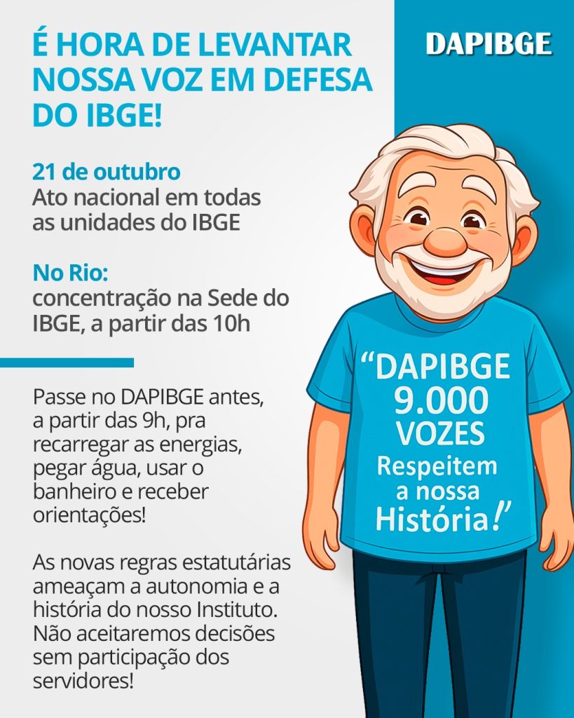 Teremos concentração aqui na sede do DAPIBGE, antes do grande ato junto com a ASSIBGE, em defesa do nosso IBGE e contra as mudanças no Estatuto.