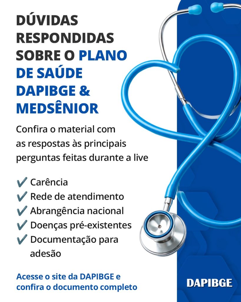 A DAPIBGE disponibilizou em seu site um documento com as respostas às principais dúvidas enviadas pelos associados durante a transmissão ao vivo de lançamento do Plano de Saúde DAPIBGE & MedSênior.