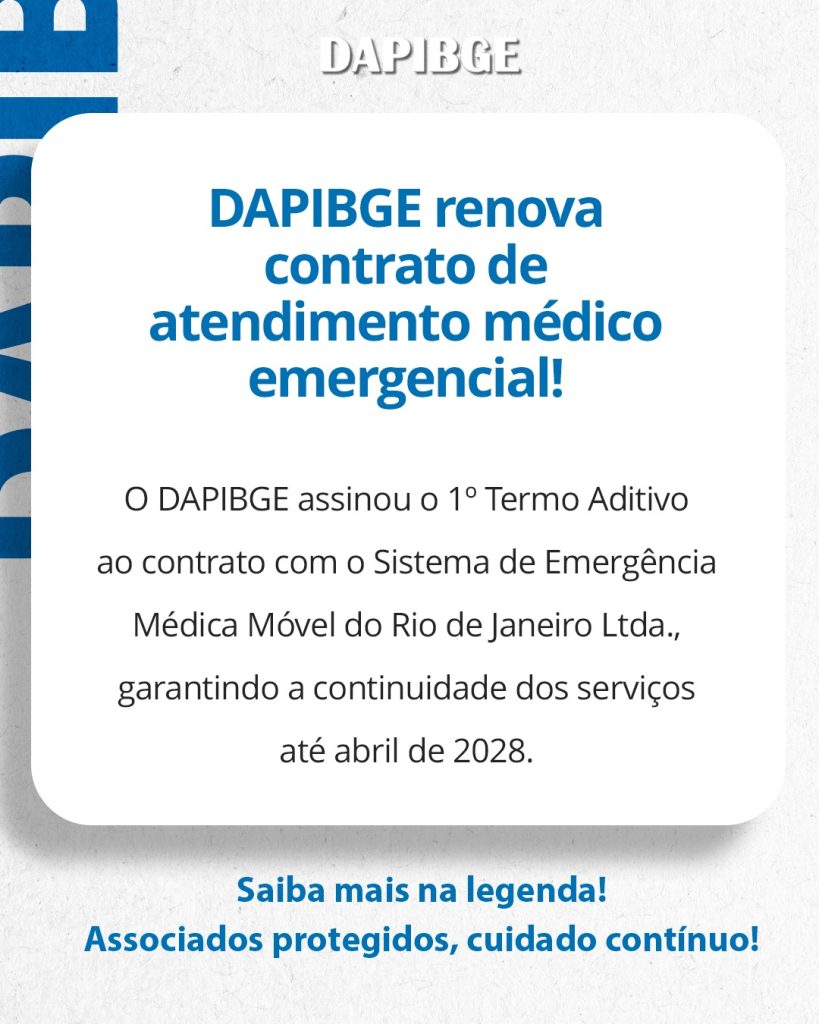 O DAPIBGE firmou, no dia 16 de outubro de 2025, o Primeiro Termo Aditivo ao Contrato de Prestação de Serviços com o Sistema de Emergência Médica Móvel do Rio de Janeiro Ltda., garantindo a continuidade do atendimento médico emergencial aos associados.