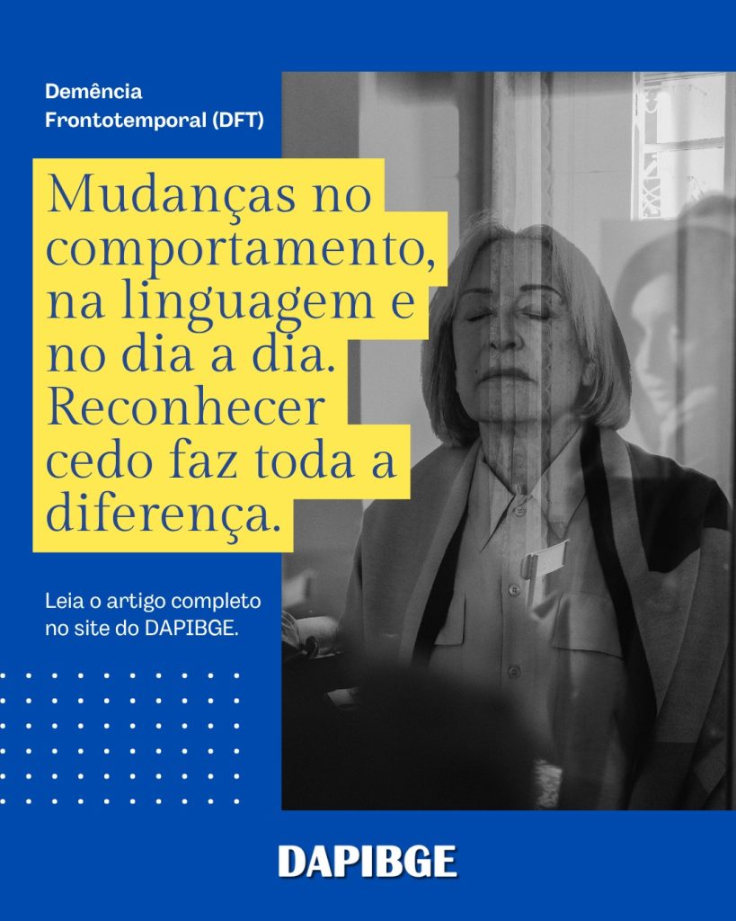 A demência frontotemporal (DFT) é uma doença neurodegenerativa que afeta os lobos frontal e temporal do cérebro, destacando-se por alterações no comportamento e linguagem, diferente do Alzheimer. Inicialmente, observa-se alterações comportamentais, incluindo perda de inibição e empatia, apatia e comportamentos compulsivos. Dificuldades linguísticas, como problemas com gramática e vocabulário, também são comuns. Além disso, são afetadas habilidades mentais como planejamento e decisão, e, em alguns casos, surgem sintomas motores. O reconhecimento precoce dos sintomas e o acompanhamento médico são cruciais, especialmente em comunidades que prezam por envelhecimento saudável, como a DAPIBGE.