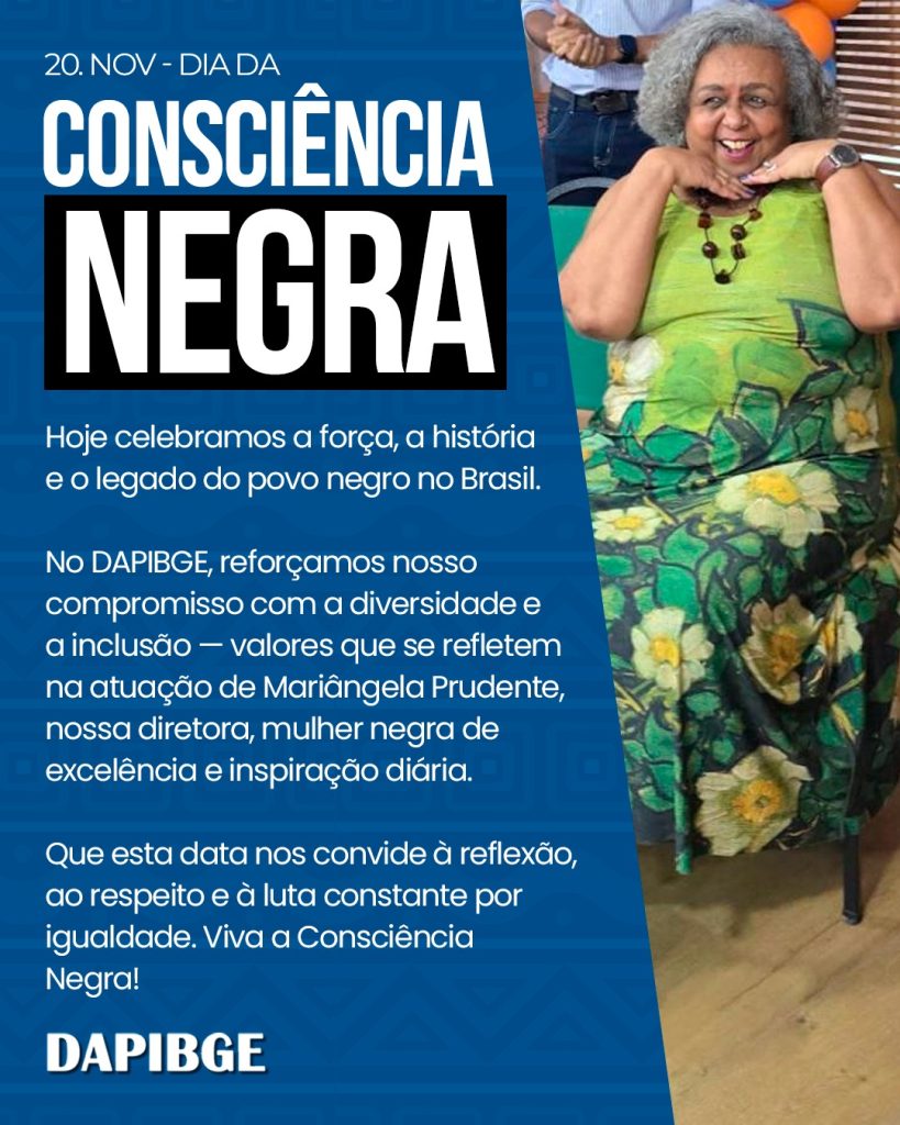 Para nós do DAPIBGE, a cor da pele nunca foi um fator de distinção, pois todos compartilhamos o mesmo sangue vermelho. Nossa associação, multicultural e unida, celebra e respeita cada uma de suas origens. Hoje, destacamos a atuação da nossa diretora Mariângela Prudente, uma mulher negra de qualidades exemplares e inteligência ímpar. Sua presença no nosso Conselho Diretor não só nos orgulha, mas também reforça nosso compromisso com a diversidade e a inclusão. Mariângela, amiga e colega há muitos anos, mais uma vez tenho o prazer de trabalhar ao seu lado, representando todos os nossos associados negros. É um abraço caloroso que se estende a toda a família negra do DAPIBGE.