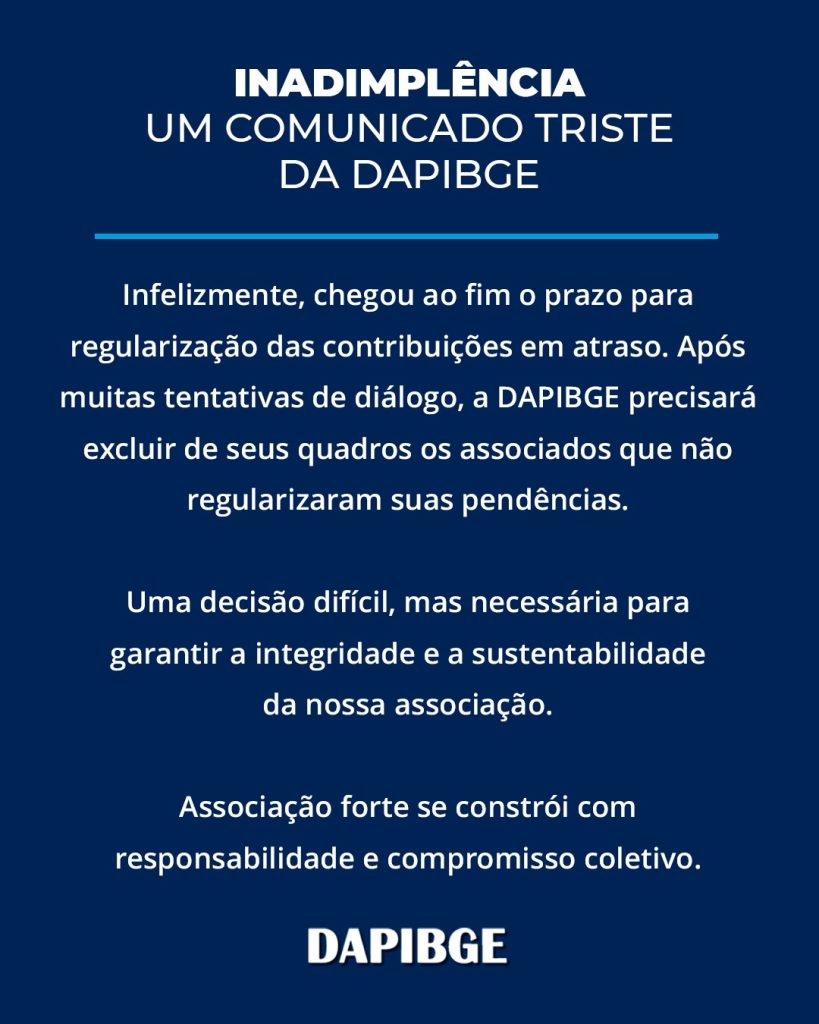 Em conformidade com os dispositivos do Estatuto Social da DAPIBGE e após reiteradas comunicações aos sócios inadimplentes, informo que se encerrou o prazo para regularização das contribuições em atraso. Como amplamente divulgado, os associados que não responderam aos nossos chamados ou que se recusaram a regularizar ou negociar suas dívidas serão submetidos a procedimentos de exclusão de nossos quadros.
