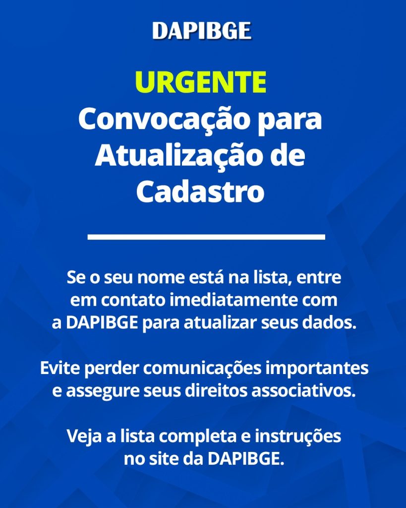 - Nos termos do artigo 5º do Estatuto da DAPIBGE, a Diretoria convoca os associados listados no anexo para atualização cadastral obrigatória até o dia 13 de novembro de 2025.